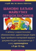 У зв’язку з карантинними обмеженнями ,адміністрація ліцею просить приносити паперовий варіант документів для зарахування до 1 класу щопонеділка з 9 до 12 год.